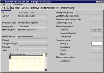 For en aktivitet anføres håndværksgruppe, prioritet, priskode og vedligeholdelsestypen. Der anføres ligeledes en aktivitetsfrekvens, hvilket vil være en startdato og en hyppighed, og et budget bestående af materialemængde og prisoplysning, som kan pristalsreguleres.